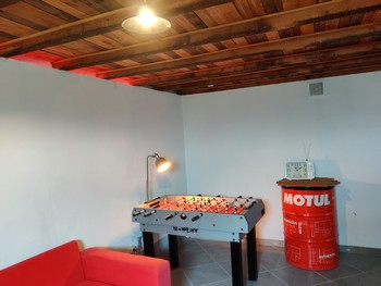- l'entrée avec coin détente et jeu (babyfoot à disposition) dans une pièce Vintage,
